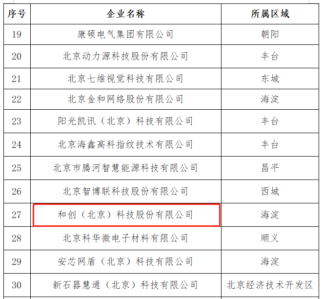 2021 年 10 月 29 日,北京市經濟和信息化局將北京市 2021 年度第六批擬認定“專精特新”中小企業名單予以公示,和創(北京)科技股份有限公司榮登榜單,此次公示期為 10 月 29 日至 11 月 4 日,目前已通過公示期。 根據北京市經濟和信息化局的評審程序的有關規定,對于公示期無異議的,認定為“北京市‘專精特新’中小企業”。