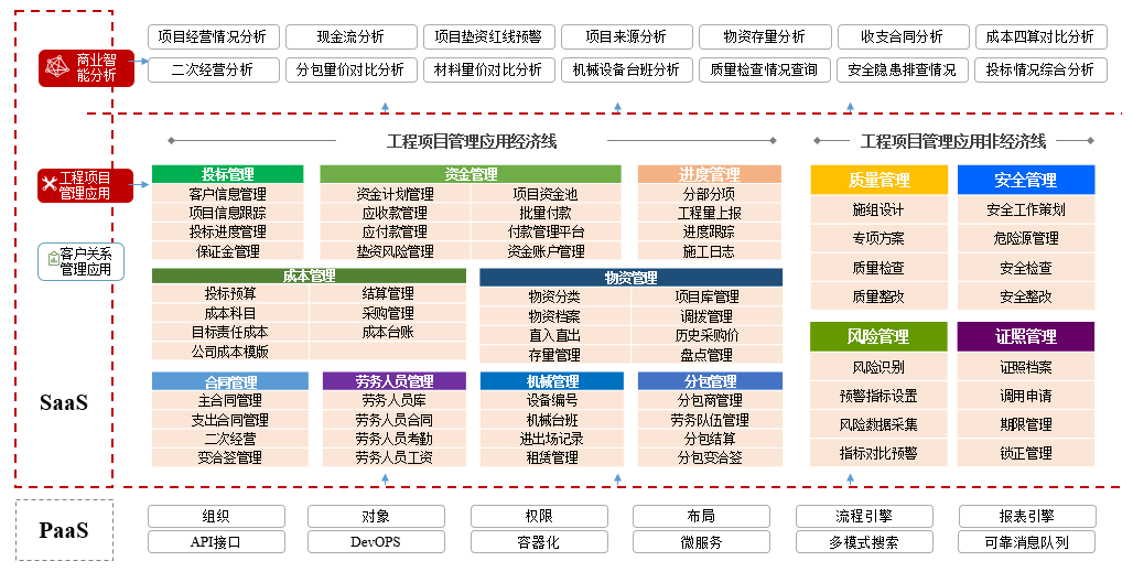 在工程項目管理領(lǐng)域,紅圈在 PaaS 平臺基礎(chǔ)上深入結(jié)合建筑工程企業(yè)的業(yè)務(wù)場景,針對其現(xiàn)金流管理薄弱、成本不可控、項目進度滯后、質(zhì)量問題頻發(fā)和安全風(fēng)險較多等痛點,通過資金管理、成本管理、物資管理、安全質(zhì)量管理、投標管理、勞務(wù)管理、證照管理等功能模塊,使執(zhí)行人員業(yè)務(wù)流程標準化、透明化。