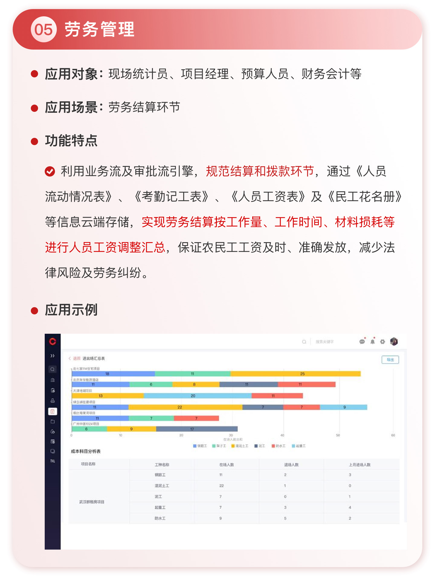 此外,紅圈系統(tǒng)能夠為建筑工程企業(yè)決策者實時呈現(xiàn)動態(tài)數(shù)據(jù)、提供智能數(shù)據(jù)分析,讓管理者實時了解項目的整體運營效率及效益是否達標、經(jīng)營風(fēng)險是否可控,滿足建筑工程企業(yè)數(shù)字化管理升級的需求,提升企業(yè)經(jīng)營管理能力,實現(xiàn)工程項目施工全生命周期的降本增效。該產(chǎn)品主要應(yīng)用于產(chǎn)值為 5,000 萬-20 億的建筑工程行業(yè)企業(yè)。
