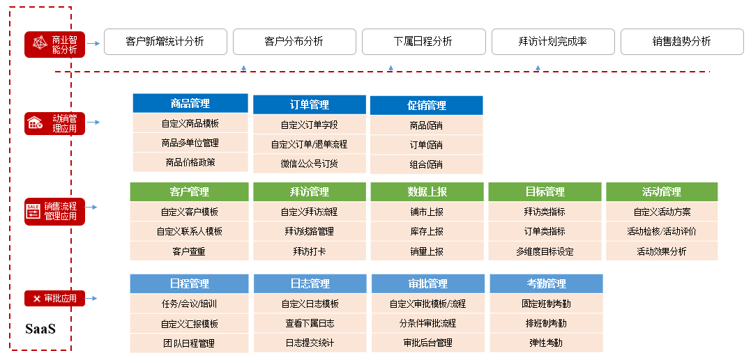 紅圈營銷+是一款兼顧通用協(xié)同辦公應(yīng)用基礎(chǔ)上,主要為泛快消行業(yè)客戶提供客戶管理與銷售協(xié)同管理的客戶關(guān)系管理 SaaS 產(chǎn)品。產(chǎn)品具有進銷存管理、車銷管理、數(shù)據(jù)上報、營銷活動管理、目標管理等功能,幫助企業(yè)有效控制營銷費用和通路管理,提高銷售管理效率,為企業(yè)提供數(shù)據(jù)賦能,助力模式轉(zhuǎn)型。