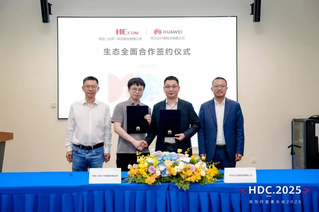 在2025華為開發者大會期間,和創(北京)科技股份有限公司(以下簡稱“和創科技”)與華為云計算技術有限公司(以下簡稱“華為云”)簽署生態全面合作協議,雙方將在聯合解決方案構建、AI應用開發及行業大模型共創等領域展開全方位合作,共同推動新一代人工智能產品在工程行業的應用落地。在和創科技CEO劉學臣、華為云生態發展與運營部部長陶志強的共同見證下,和創科技副總裁王禹、華為云北京云生態發展與運營部部長代表雙方完成簽約。