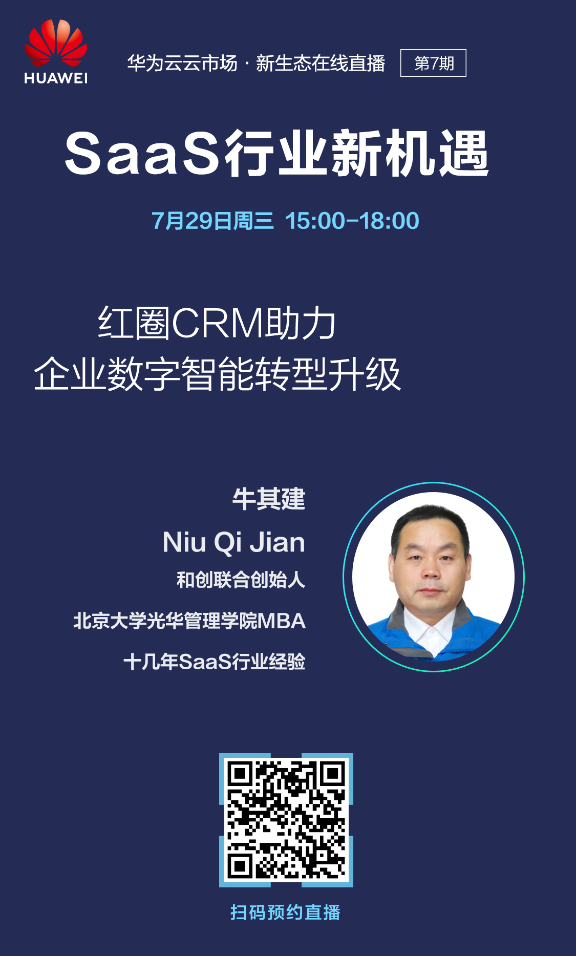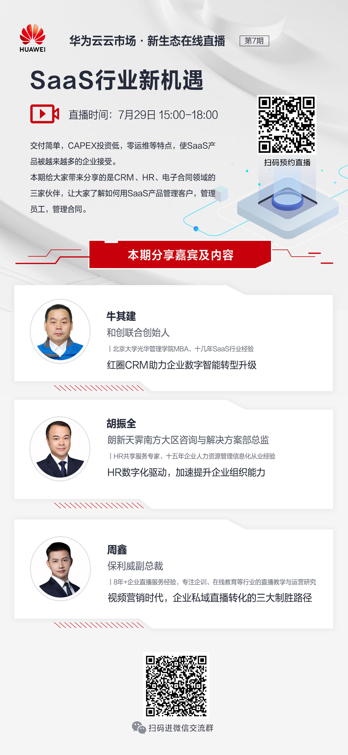 7月29日下午三點請鎖定"華為云云市場.新生態在線直播系列活動第七期《SaaS行業新機遇》